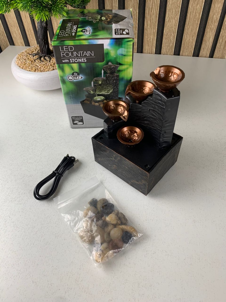 3️⃣ إضاءة LED دافئةالإضاءة المدمجة LED تُبرز جمال حركة المياه وتضيف توهجًا لطيفًا يجعل النافورة قطعة ديكور رائعة سواءً على المكتب أو الرف أو طاولة القهوة.