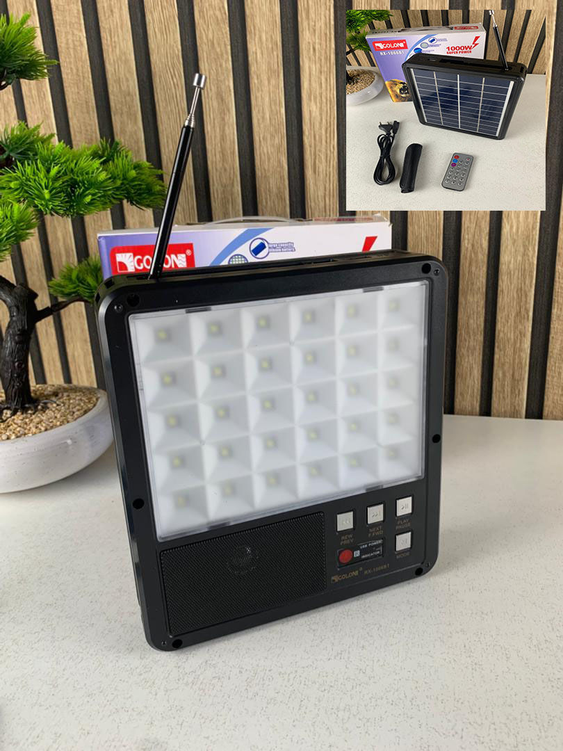 لمبة RX-1066BT تجمعلك الإنارة، الشحن، الموسيقى، والراديو في جهاز واحد صغير، عملي، وسهل الاستعمال. مثالية للدار، الفيرما، المخزن، الرحلات، وحتى للطوارئ.
