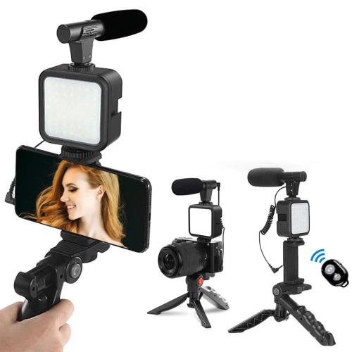نظام إضاءة LED، ميكروفون احترافي، وحامل هاتف قابل للتعديل — إعداد متكامل لتصوير فيديو عالي الجودة في أي مكان.